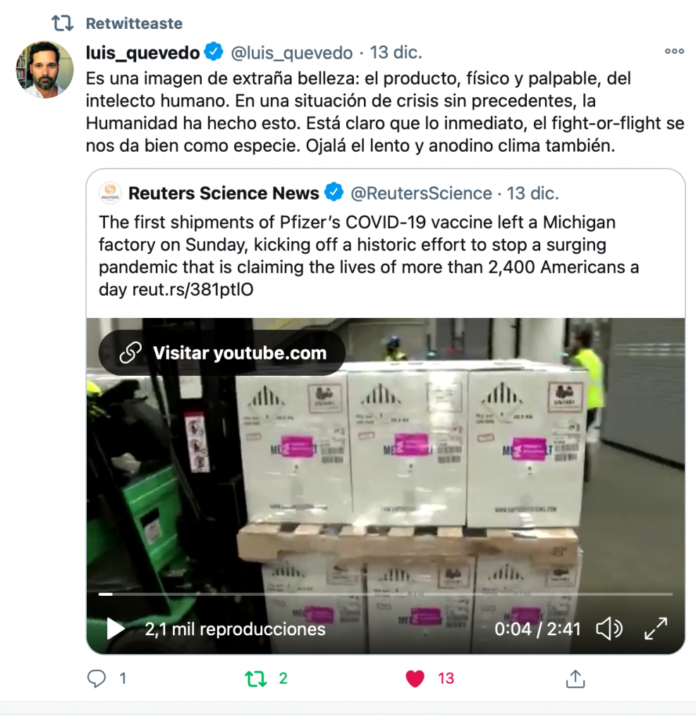 La reacción de la humanidad ante la amenaza de su supervivencia en forma de logro cientifico, logístico y económico de una vacuna viable en meses.