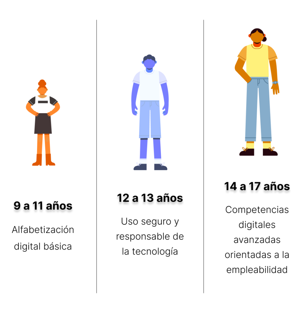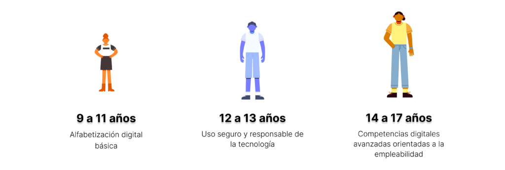 Esta línea formativa está orientada a niños y niñas de 9 a 11 años y se centra en desarrollar competencias digitales básicas. La metodología se basa en el storytelling, utilizando personajes y misiones que facilitan el aprendizaje de habilidades digitales esenciales. El contenido se organiza en cinco etapas, cada una con seis misiones que abordan las siguientes áreas: