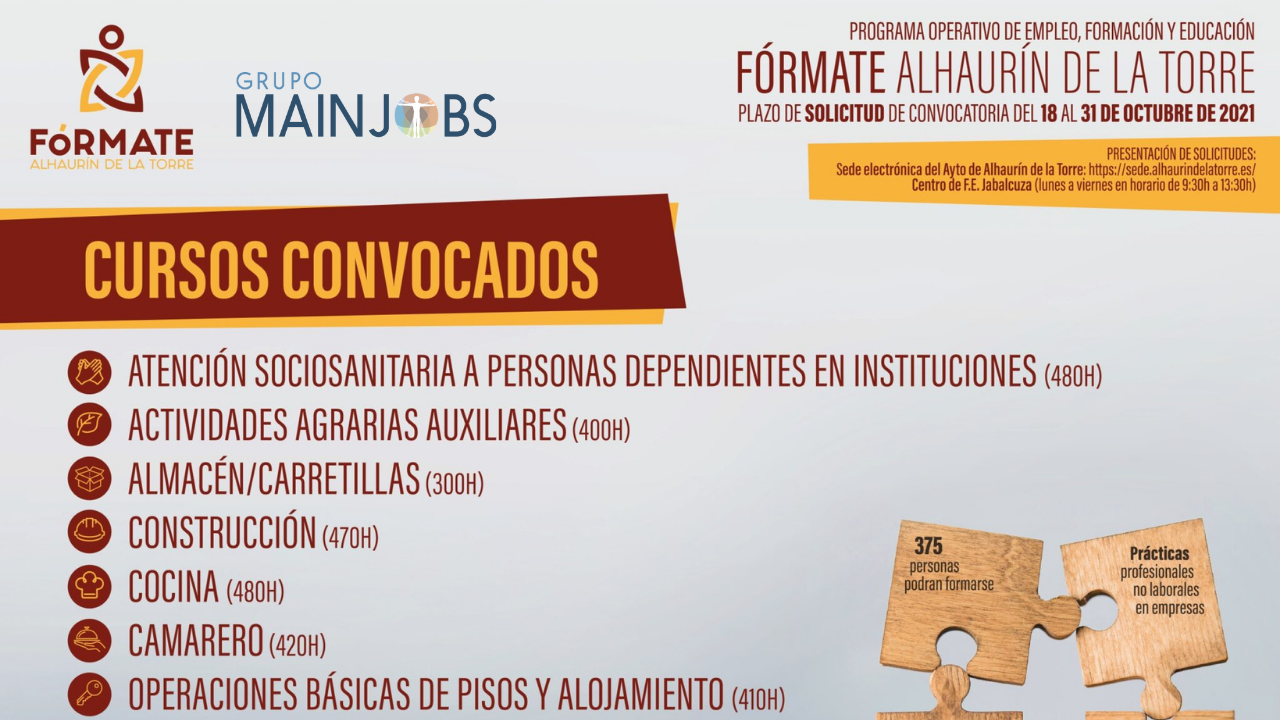 Grupo MainJobs colabora en la impartición de los itinerarios formativos del Ayuntamiento de Alhaurín de la Torre. Ya está abierto el plazo de solicitudes para la tercera convocatoria del Proyecto Fórmate- Alhaurín de la Torre, enmarcado dentro del Programa Operativo de Empleo, Formación y Educación (POEFE), subvencionado por el Fondo Social Europeo y destinado a entidades locales para cofinanciar iniciativas o proyectos para promover la inclusión social, la lucha contra la pobreza y cualquier forma de discriminación.