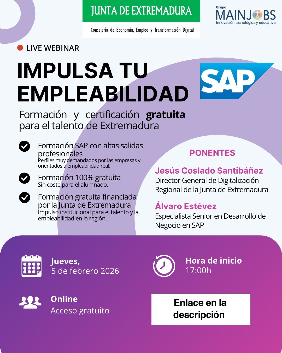 Apúntate a nuestra webinar sobre formación y certificación SAP gratuita para el talento de Extremadura. Descúbrelo toda la información en este post y asiste el 5 de febrero de 2026 a las 17:00h.