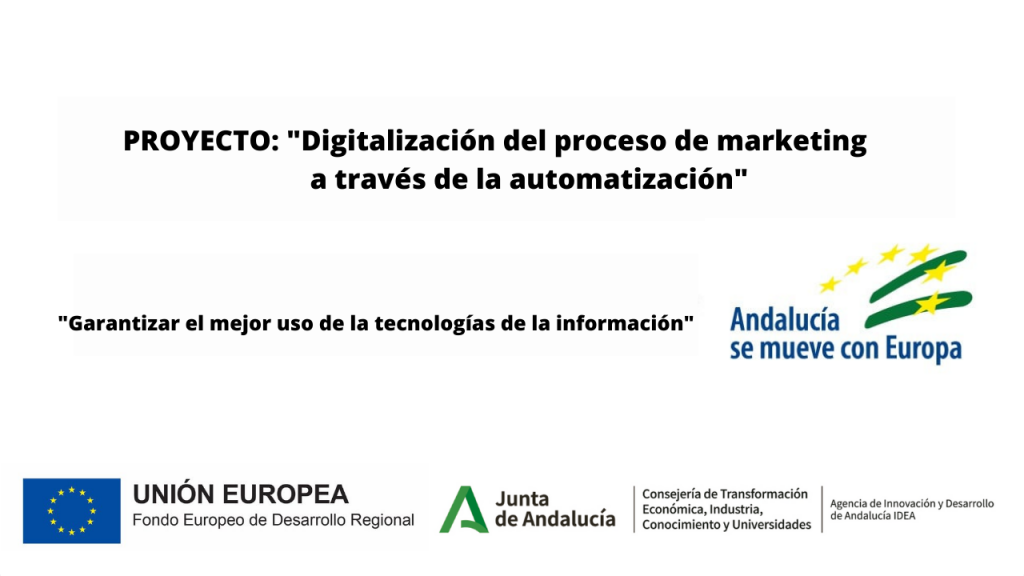 Se ha recibido un incentivo de la Agencia de Innovación y Desarrollo de Andalucía IDEA, de la Junta de Andalucía, por un importe de 3.110€, cofinanciado en un 80% por la Unión Europea a través del Fondo Europeo de Desarrollo Regional, FEDER para la realización del proyecto Digitalización del proceso de marketing a través de la automatización con el objetivo de garantizar un mejor uso de las tecnologías de la información.